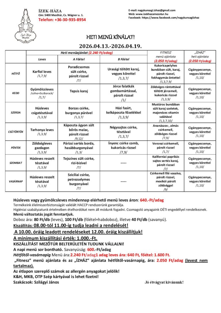 „Fitnesz” menü ajánlata és az „ÍZHÁZ” ajánlata hétfőtől-vasárnapig,